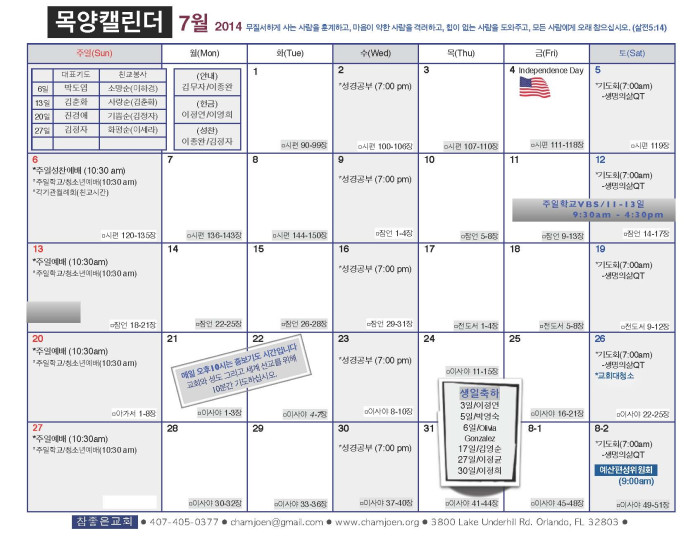 2014년 7월 목양 캘린더 페이지 정보 작성자 박도엽 댓글 0건 조회 2,056회 작성일 14-07-02 06:42 목록 본문 2014년 7월 목양 캘린더입니다. 댓글 0 댓글목록 등록된 댓글이 없습니다. 목록