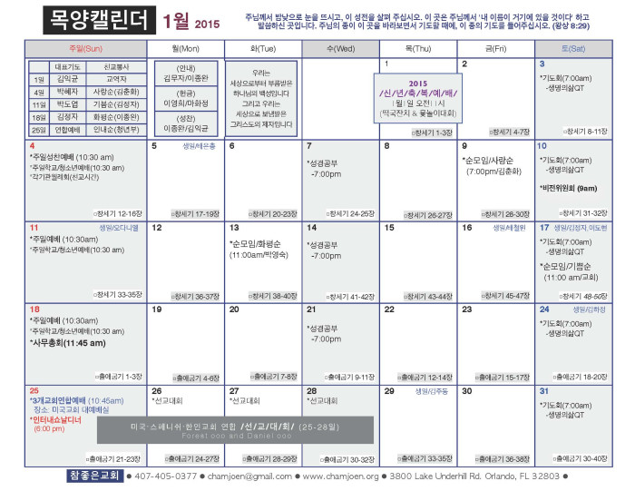 2015년 1월 목양 캘린더 페이지 정보 작성자 박도엽 댓글 0건 조회 2,043회 작성일 15-01-01 11:10 목록 본문 2015년 1월 목양 캘린더입니다. 댓글 0 댓글목록 등록된 댓글이 없습니다. 목록