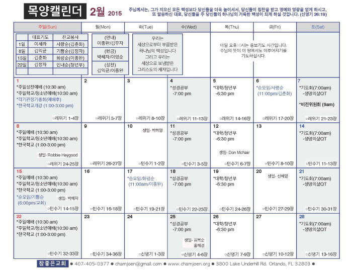 2015년 2월 목양 캘린더 페이지 정보 작성자 박도엽 댓글 0건 조회 1,912회 작성일 15-01-31 04:10 목록 본문 2015년 2월 목양 캘린더입니다. 댓글 0 댓글목록 등록된 댓글이 없습니다. 목록