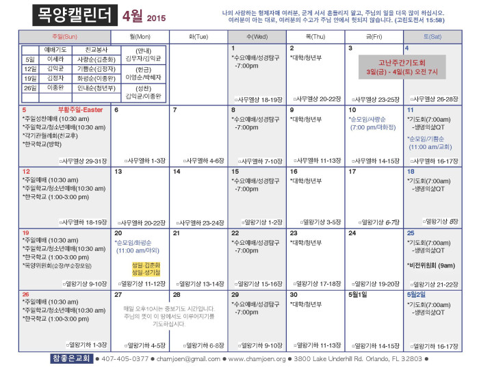 2015년 4월 목양 캘린더 페이지 정보 작성자 박도엽 댓글 0건 조회 2,014회 작성일 15-04-03 09:32 목록 본문 2015년 4월 목양 캘린더입니다. 댓글 0 댓글목록 등록된 댓글이 없습니다. 목록