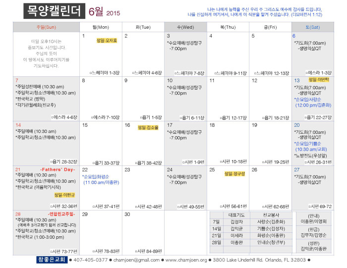2015년 6월 목양 캘린더 페이지 정보 작성자 박도엽 댓글 0건 조회 2,056회 작성일 15-06-01 15:17 목록 본문 2015년 6월 목양 캘린더입니다. 댓글 0 댓글목록 등록된 댓글이 없습니다. 목록