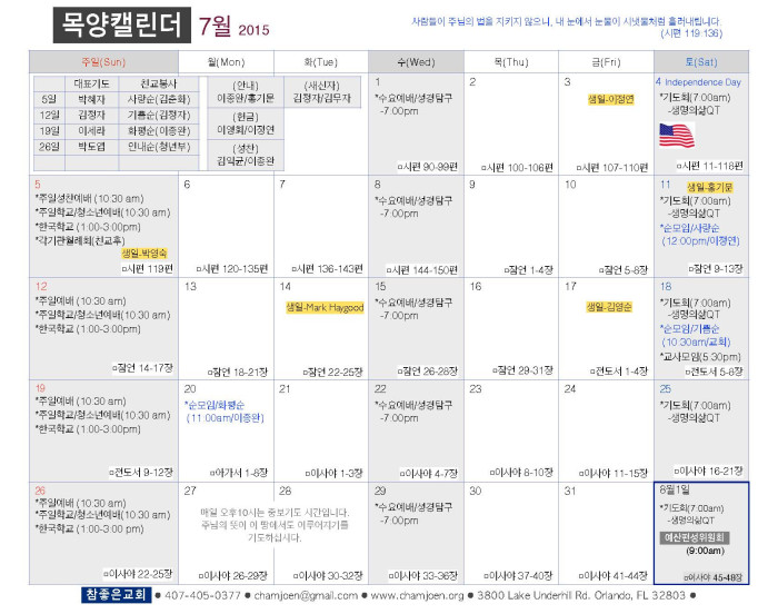 2015년 7월 목양 캘린더 페이지 정보 작성자 박도엽 댓글 0건 조회 2,234회 작성일 15-07-02 15:59 목록 본문 2015년 7월 목양 캘린더입니다. 댓글 0 댓글목록 등록된 댓글이 없습니다. 목록