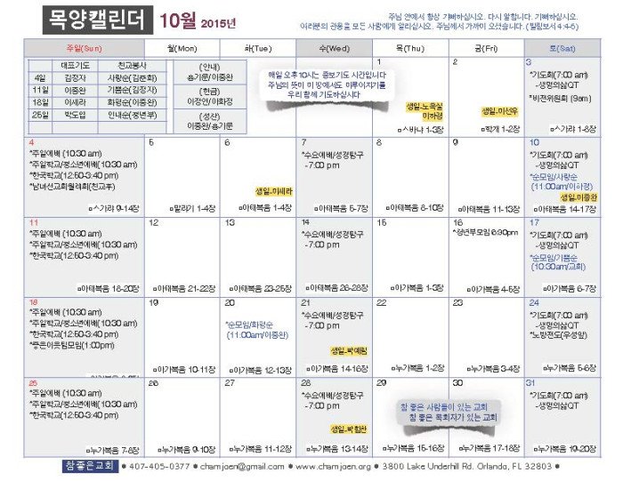 2015년 10월 목양 캘린더 페이지 정보 작성자 박도엽 댓글 0건 조회 1,948회 작성일 15-09-29 10:38 목록 본문 2015년 10월 목양 캘린더입니다. 댓글 0 댓글목록 등록된 댓글이 없습니다. 목록