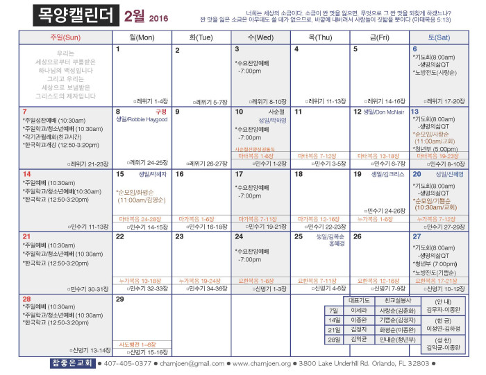 2016년 2월 목양 캘린더 페이지 정보 작성자 박도엽 댓글 0건 조회 2,183회 작성일 16-02-14 11:46 목록 본문 2016년 2월 목양 캘린더입니다. 댓글 0 댓글목록 등록된 댓글이 없습니다. 목록
