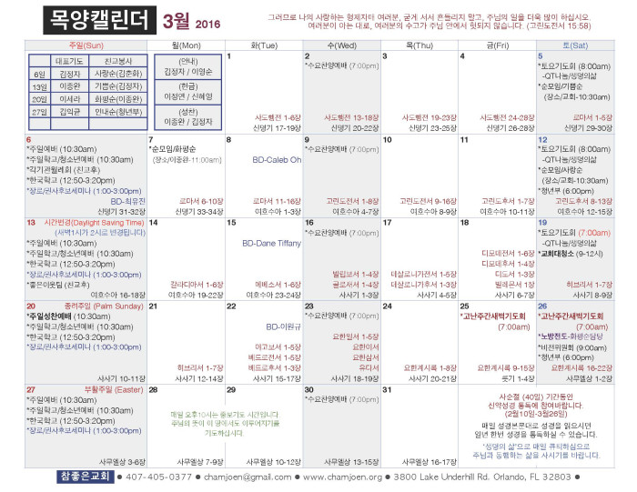 2016년 3월 목양 캘린더 페이지 정보 작성자 박도엽 댓글 0건 조회 1,910회 작성일 16-03-01 11:11 목록 본문 2016년 3월 목양 캘린더입니다. 댓글 0 댓글목록 등록된 댓글이 없습니다. 목록