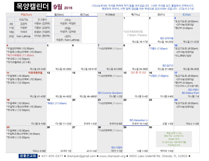2016년 9월 목양 캘린더 페이지 정보 작성자 박도엽 댓글 0건 조회 2,056회 작성일 16-08-30 12:50 목록 본문 2016년 9월 목양 캘린더입니다. 댓글 0 댓글목록 등록된 댓글이 없습니다. 목록