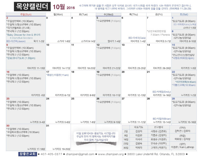 2016년 10월 목양 캘린더 페이지 정보 작성자 박도엽 댓글 0건 조회 2,013회 작성일 16-09-26 14:55 목록 본문 2016년 10월 목양 캘린더입니다. 댓글 0 댓글목록 등록된 댓글이 없습니다. 목록