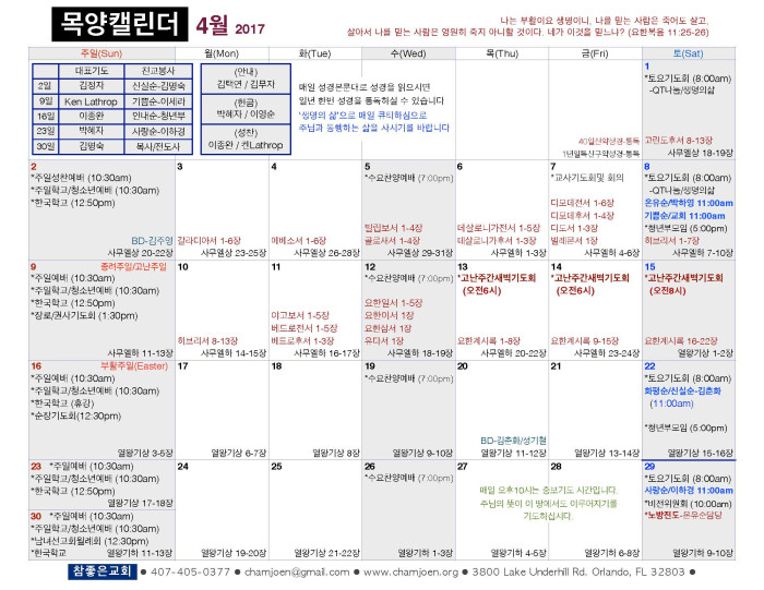 2017년 4월 목양 캘린더 페이지 정보 작성자 박도엽 댓글 0건 조회 2,211회 작성일 17-03-27 23:51 목록 본문 2017년 4월 목양 캘린더입니다. 댓글 0 댓글목록 등록된 댓글이 없습니다. 목록