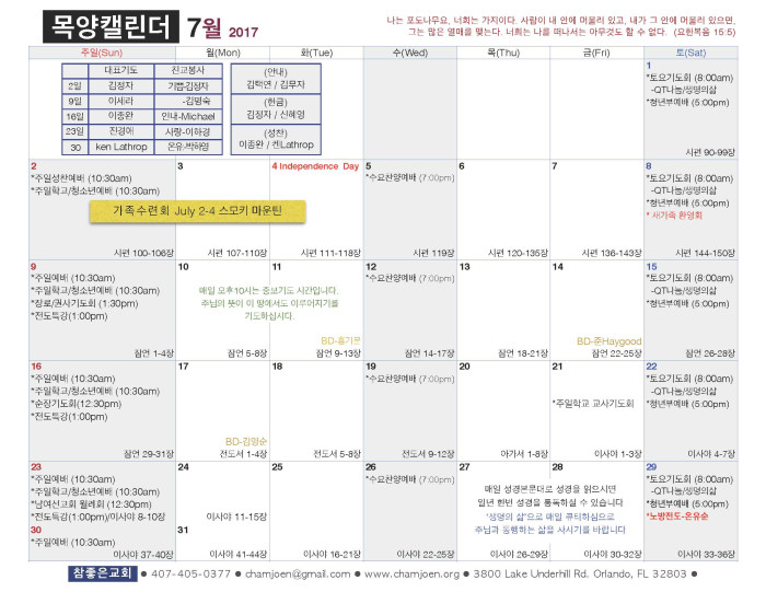 2017년 7월 목양 캘린더 페이지 정보 작성자 System Operator 댓글 0건 조회 1,944회 작성일 17-10-30 10:05 목록 본문 2017년 7월 목양 캘린더입니다. 댓글 0 댓글목록 등록된 댓글이 없습니다. 목록