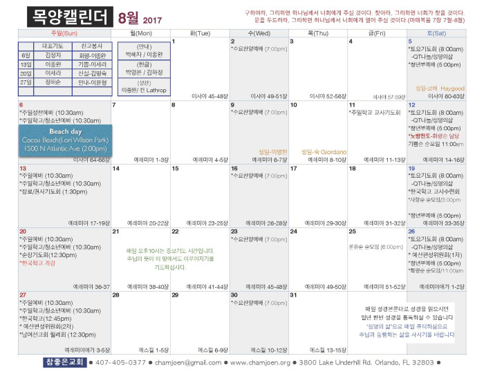 2017년 8월 목양 캘린더 페이지 정보 작성자 System Operator 댓글 0건 조회 2,036회 작성일 17-10-30 10:06 목록 본문 2017년 8월 목양 캘린더입니다. 댓글 0 댓글목록 등록된 댓글이 없습니다. 목록