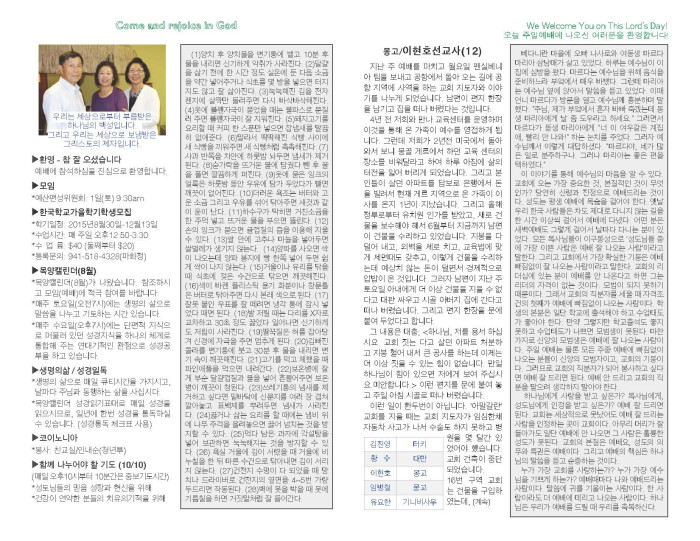 2015년 7월 26일 교회 주보 페이지 정보 작성자 박도엽 댓글 0건 조회 3,149회 작성일 15-07-27 15:05 목록 본문 2015년 7월 26일 교회 주보입니다. 댓글 0 댓글목록 등록된 댓글이 없습니다. 목록