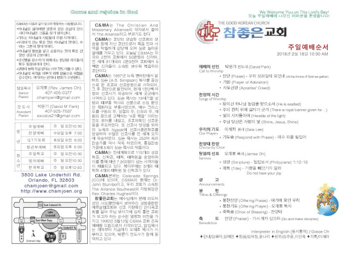 2018-02-18 교회 주보 페이지 정보 작성자 System Operator 댓글 0건 조회 3,084회 작성일 18-02-18 08:11 목록 본문 2018-02-18 교회 주보입니다. 댓글 0 댓글목록 등록된 댓글이 없습니다. 목록