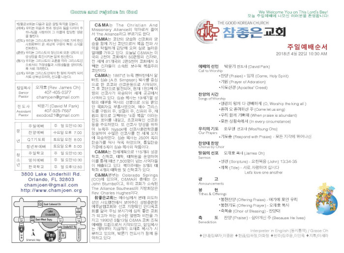 2018-04-22 교회 주보 페이지 정보 작성자 System Operator 댓글 0건 조회 2,888회 작성일 18-04-22 13:17 목록 본문 2018-04-22 교회 주보입니다. 댓글 0 댓글목록 등록된 댓글이 없습니다. 목록