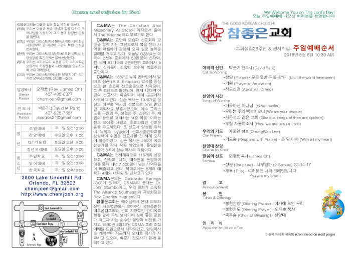 2018-05-06 교회 주보 페이지 정보 작성자 System Operator 댓글 0건 조회 3,225회 작성일 18-05-06 10:17 목록 본문 2018-05-06 교회 주보입니다. 댓글 0 댓글목록 등록된 댓글이 없습니다. 목록