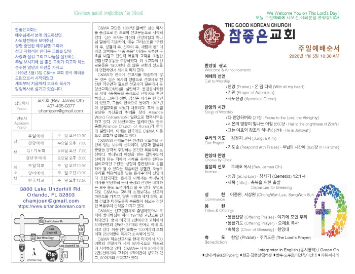 2020-01-05 예배 주보 페이지 정보 작성자 System Operator 댓글 0건 조회 1,944회 작성일 20-01-05 13:00 목록 본문 2020-01-05 예배 주보입니다. 댓글 0 댓글목록 등록된 댓글이 없습니다. 목록