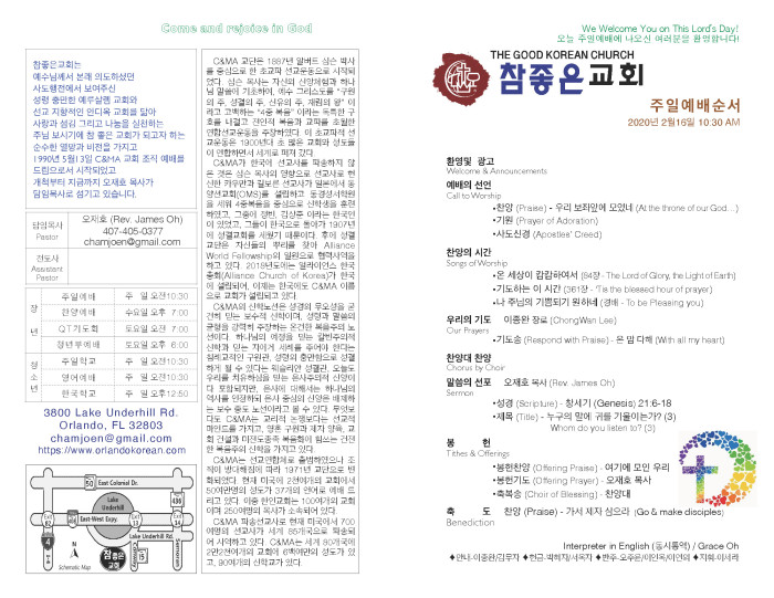 THE Good Korean Church of C&MA 3800 Lake Underhill Rd. Orlando.FL32803 / Tel: 407-733-2366 / E-Mail: chamjoengkc@gmail.com