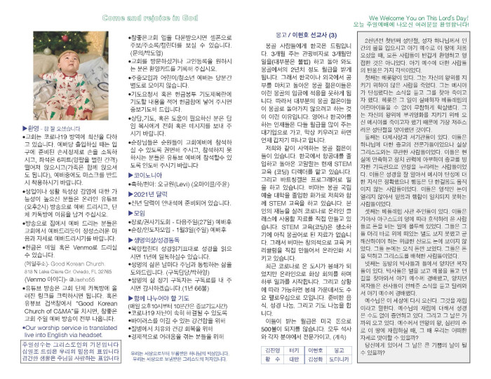 2020-12-20 예배 주보 페이지 정보 작성자 System Operator 댓글 0건 조회 2,040회 작성일 20-12-20 09:10 목록 본문 2020-12-20 예배 주보입니다. 댓글 0 댓글목록 등록된 댓글이 없습니다. 목록