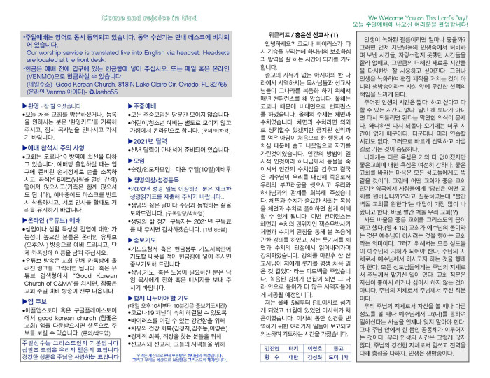 2021-01-03 예배 주보 페이지 정보 작성자 System Operator 댓글 0건 조회 1,963회 작성일 21-01-04 13:05 목록 본문 2021-01-03 예배 주보입니다. 댓글 0 댓글목록 등록된 댓글이 없습니다. 목록