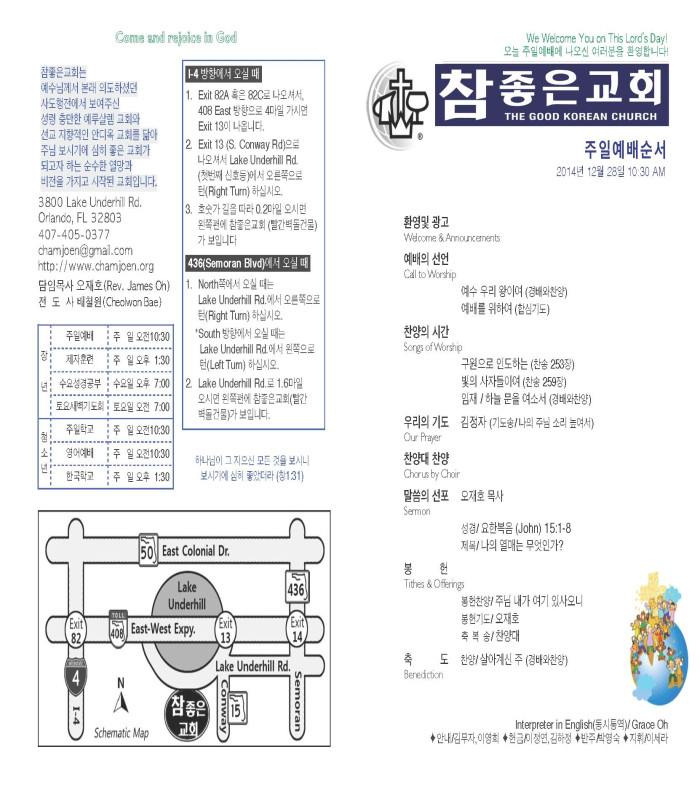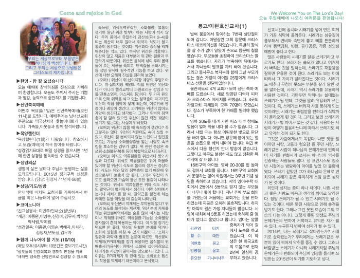 2014년 12월 28일 교회 주보 페이지 정보 작성자 박도엽 댓글 0건 조회 3,087회 작성일 15-01-01 11:12 목록 본문 2014년 12월 28일 교회 주보입니다. 댓글 0 댓글목록 등록된 댓글이 없습니다. 목록