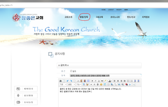 메인 홈페이지에서 위에 메뉴 말씀/양육 (위에 캡쳐된 사진을 참고하세요) 클릭하시면