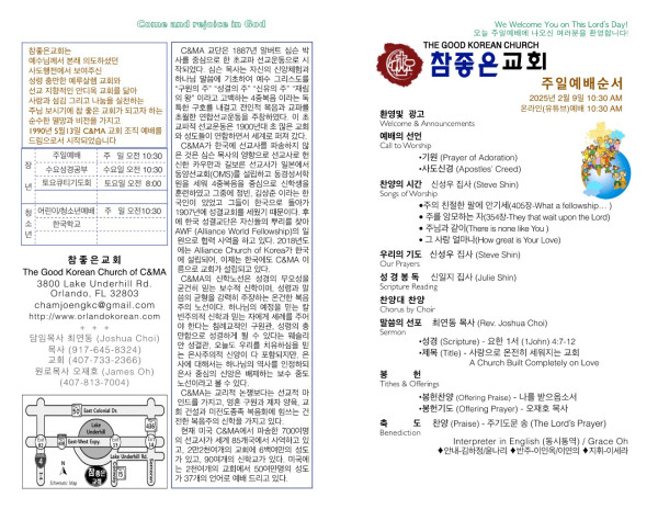2025-02-09 참좋은 교회 주보 페이지 정보 작성자 참좋은교회 댓글 0건 조회 1,487회 작성일 25-02-09 17:55 목록 본문 2025-02-09 참좋은 교회 주보입니다. 이전글2025-02-16 참좋은 교회 주보 25.02.16 다음글2025-02-02 참좋은 교회 주보 25.02.02 댓글 0 댓글목록 등록된 댓글이 없습니다. 목록