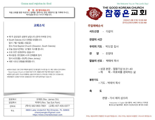 2024-04-21 참좋은 교회 주보 페이지 정보 작성자 참좋은교회 댓글 0건 조회 4,757회 작성일 24-04-23 17:55 목록 본문 2024-04-21 참좋은 교회 주보입니다. 이전글2024-04-28 참좋은 교회 주보 24.05.02 다음글2024-04-14 참좋은 교회 주보 24.04.16 댓글 0 댓글목록 등록된 댓글이 없습니다. 목록