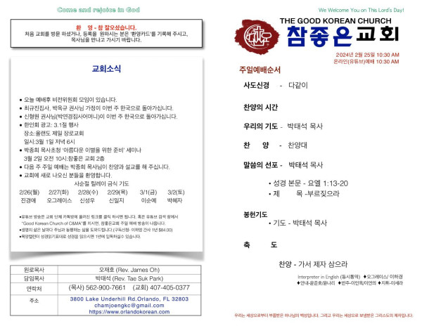 2024-02-25 참좋은 교회 주보 페이지 정보 작성자 참좋은교회 댓글 0건 조회 3,395회 작성일 24-02-25 14:32 목록 본문 2024-02-25 참좋은 교회 주보입니다. 이전글2024-03-03 참좋은 교회 주보 24.03.03 다음글2024-02-18 참좋은 교회 주보 24.02.19 댓글 0 댓글목록 등록된 댓글이 없습니다. 목록