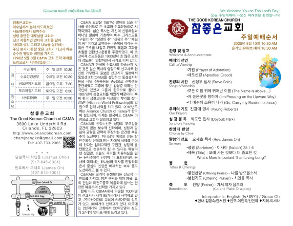 2025-08-10 참좋은 교회 주보 페이지 정보 작성자 참좋은교회 댓글 0건 조회 897회 작성일 25-08-10 16:05 목록 본문 2025-08-10 참좋은 교회 주보입니다. 이전글2025-08-17 참좋은 교회 주보 25.08.17 다음글2025-08-03 참좋은 교회 주보 25.08.03 댓글 0 댓글목록 등록된 댓글이 없습니다. 목록