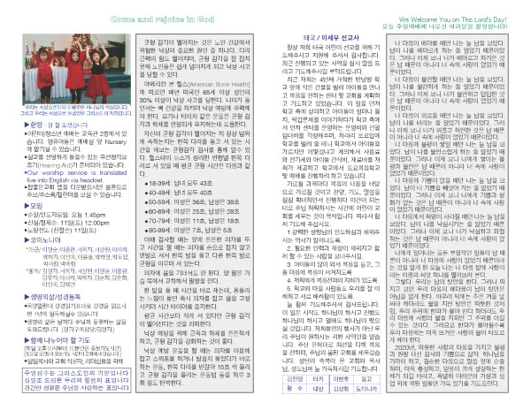 2020-01-05 예배 주보 페이지 정보 작성자 System Operator 댓글 0건 조회 4,843회 작성일 20-01-05 13:00 목록 본문 2020-01-05 예배 주보입니다. 이전글2019-01-12 예배 주보 20.01.12 다음글2019-12-31 송구영신 예배 20.01.05 댓글 0 댓글목록 등록된 댓글이 없습니다. 목록