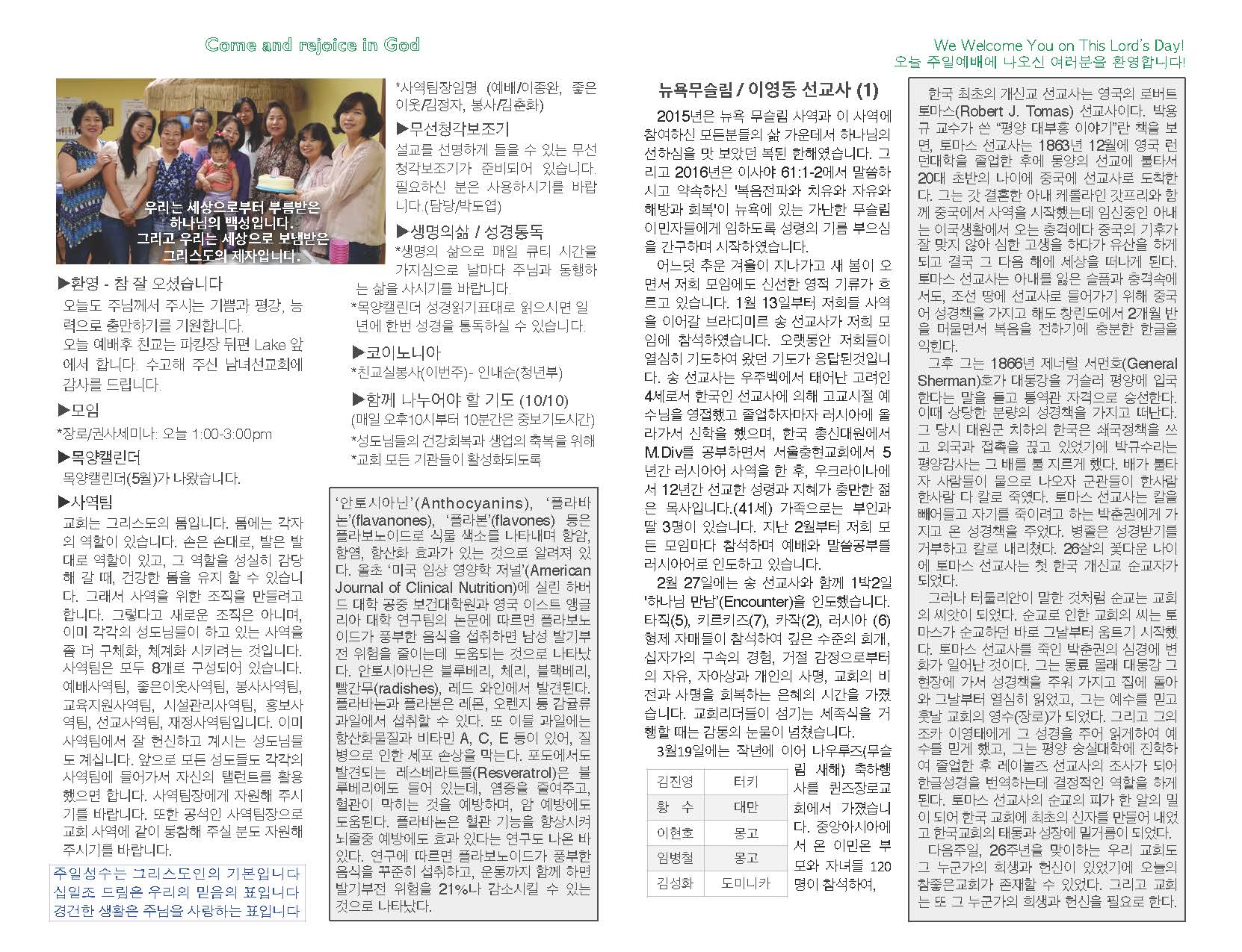 2016년 5월 01일 교회 주보