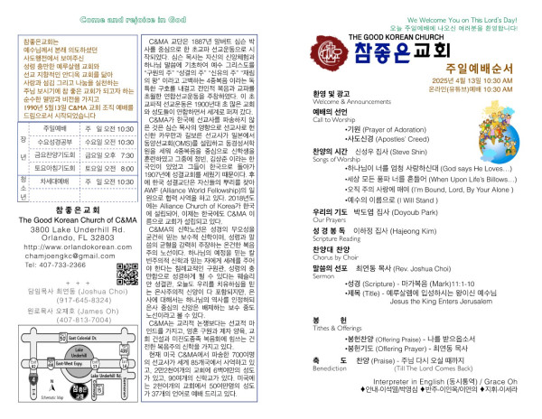 2025-04-13 참좋은 교회 주보 페이지 정보 작성자 참좋은교회 댓글 0건 조회 1,455회 작성일 25-04-13 16:23 목록 본문 2025-04-13 참좋은 교회 주보입니다. 이전글2025-04-20 참좋은 교회 주보 25.04.20 다음글2025-04-06 참좋은 교회 주보 25.04.06 댓글 0 댓글목록 등록된 댓글이 없습니다. 목록