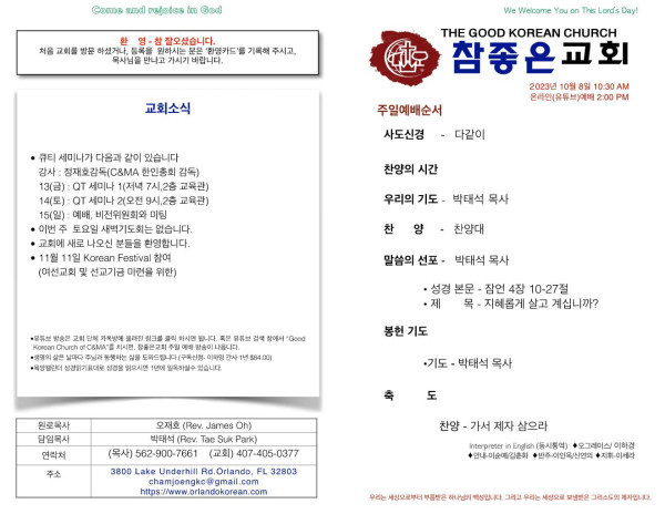 2023-10-08 참좋은 교회 주보 페이지 정보 작성자 참좋은교회 댓글 0건 조회 5,707회 작성일 23-10-09 06:16 목록 본문 2023-10-08 참좋은 교회 주보입니다. 이전글2023-10-15 참좋은 교회 주보 23.10.16 다음글2023-10-01 참좋은 교회 주보 23.10.02 댓글 0 댓글목록 등록된 댓글이 없습니다. 목록