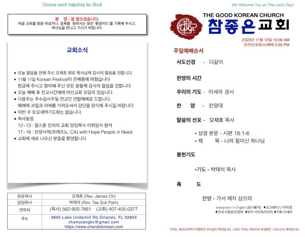 2023-11-12 참좋은 교회 주보 페이지 정보 작성자 참좋은교회 댓글 0건 조회 5,642회 작성일 23-11-13 05:51 목록 본문 2023-11-12 참좋은 교회 주보입니다. 이전글2023-11-19 참좋은 교회 주보 23.11.20 다음글2023-11-05 참좋은 교회 주보 23.11.06 댓글 0 댓글목록 등록된 댓글이 없습니다. 목록