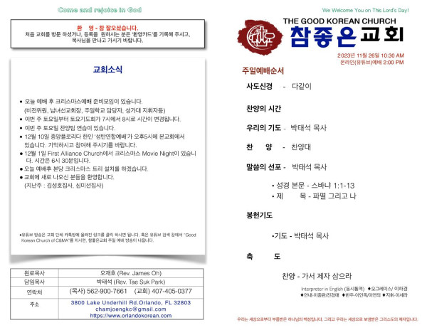 2023-11-26 참좋은 교회 주보 페이지 정보 작성자 참좋은교회 댓글 0건 조회 5,472회 작성일 23-11-27 17:19 목록 본문 2023-11-26 참좋은 교회 주보입니다. 이전글2023-12-03 참좋은 교회 주보 23.12.04 다음글2023-11-19 참좋은 교회 주보 23.11.20 댓글 0 댓글목록 등록된 댓글이 없습니다. 목록